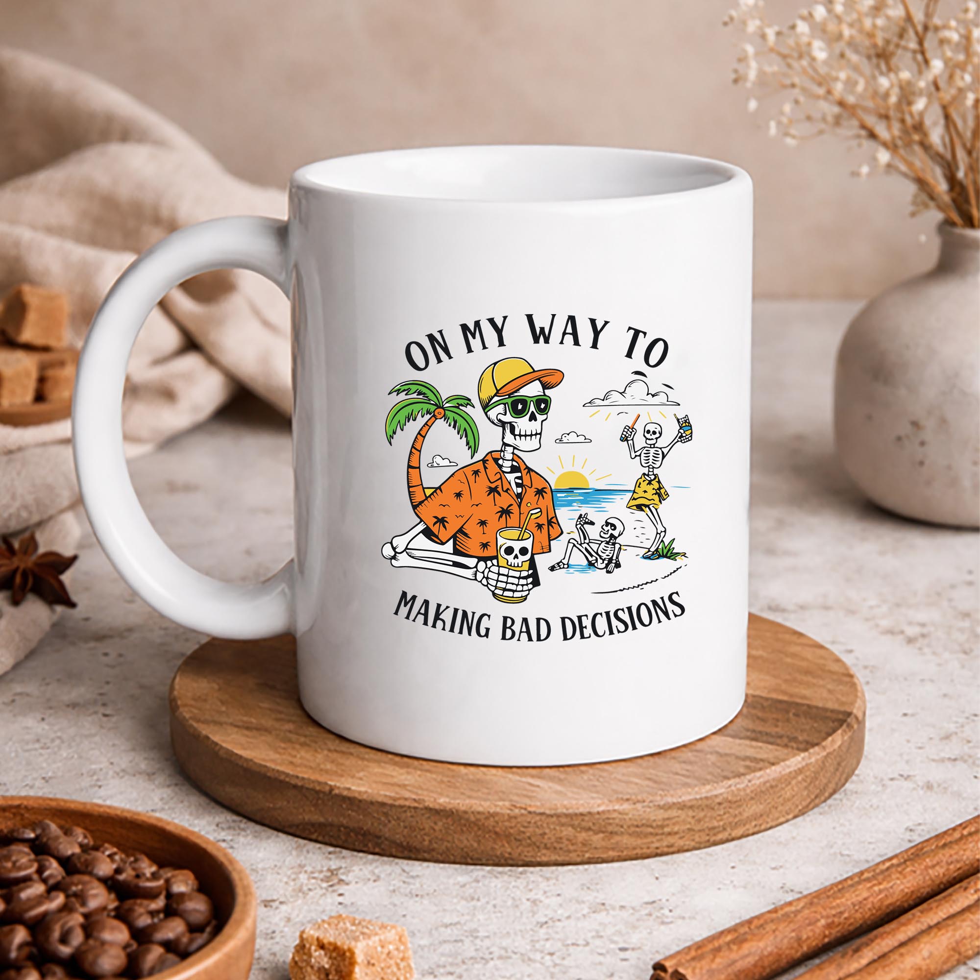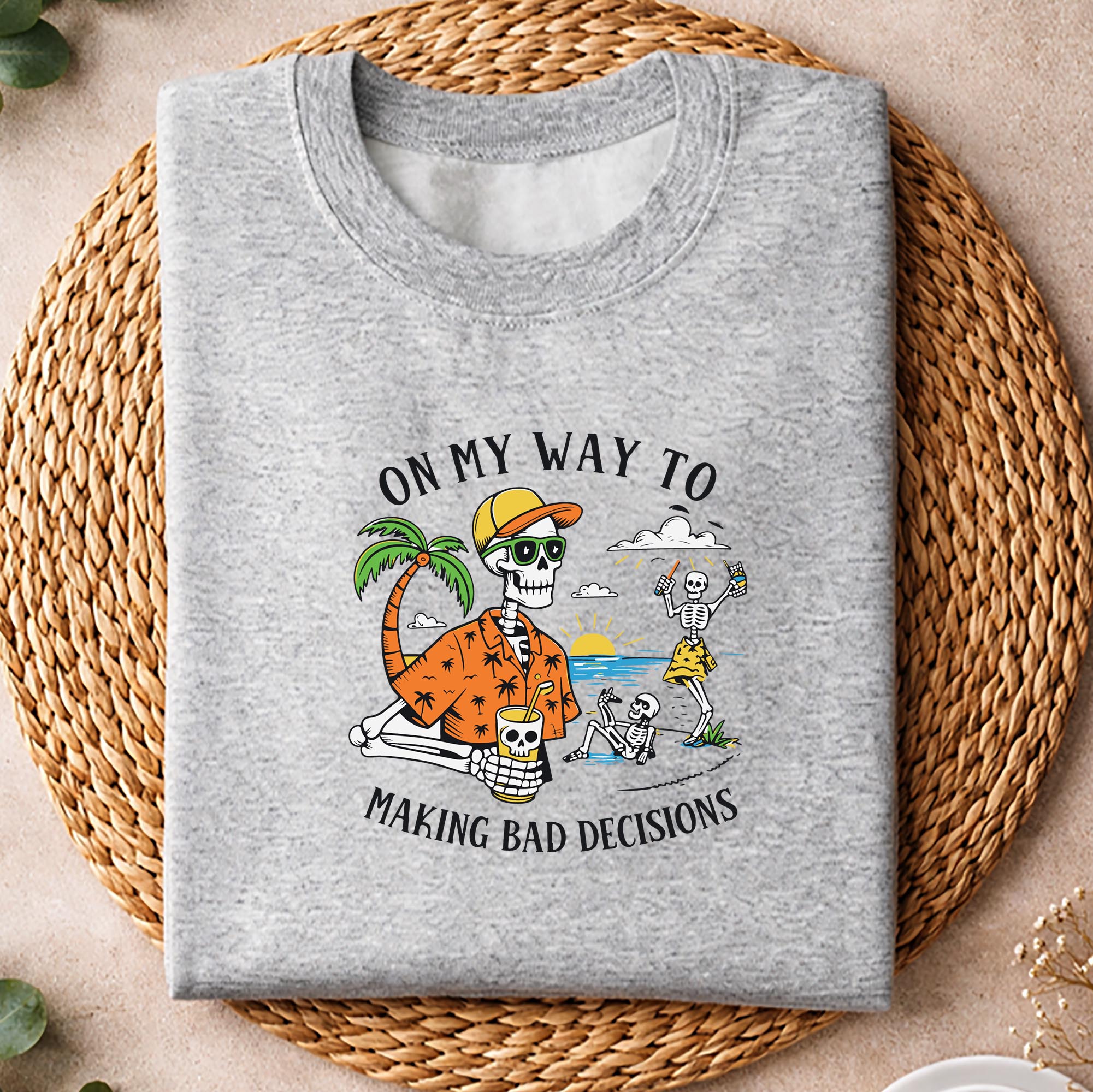 Feel the carefree rush of sun, salt air, and zero regrets with this bold and cheeky “On My Way to Making Bad Decisions” Skeleton Beach design. It captures that perfect vacation mood where rules don’t apply and every moment is about fun, laughter, and living a little wildly. This eye-catching graphic blends humor with laid-back beach vibes, making it a standout choice for anyone who loves a good laugh and a great time. Whether you are heading to a tropical getaway, planning a summer party, or just want to bring that beach energy into your everyday style, this design delivers personality and attitude in all the right ways. Perfect for print on demand apparel like t shirts, tank tops, or hoodies, it also works beautifully on beach totes, drinkware, or wall art for a fun coastal decor touch. It makes a hilarious gift for friends, vacation crews, bachelor or bachelorette trips, or anyone known for their spontaneous spirit. With its trendy skeleton theme and playful message, this design taps into popular summer fashion, beach aesthetic, and funny graphic tee trends that shoppers love. It is made to spark smiles, start conversations, and celebrate those unforgettable, carefree moments.