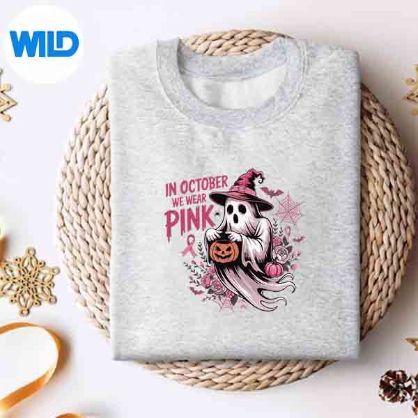 In October We Wear Pink Ghost Witch Breast Cancer Awareness Love