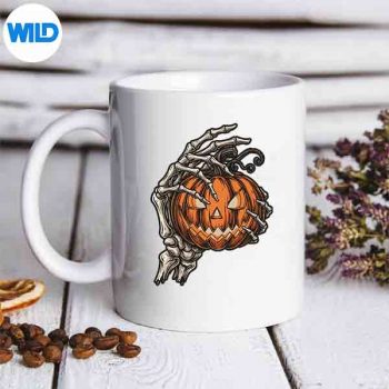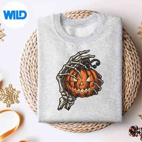 Skeleton Hand Holding Pumpkin Scary Halloween