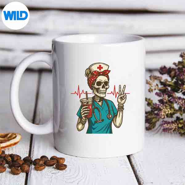 Skeleton Nurse Coffee Lover Halloween Impactful SVG PNG File. Result-driving digital download with high-visual-impact SVG vector and attention-commanding PNG formats for memorable craft output. Perfect for product launches, seasonal promotions, and craft market introductions requiring maximum visual presence.