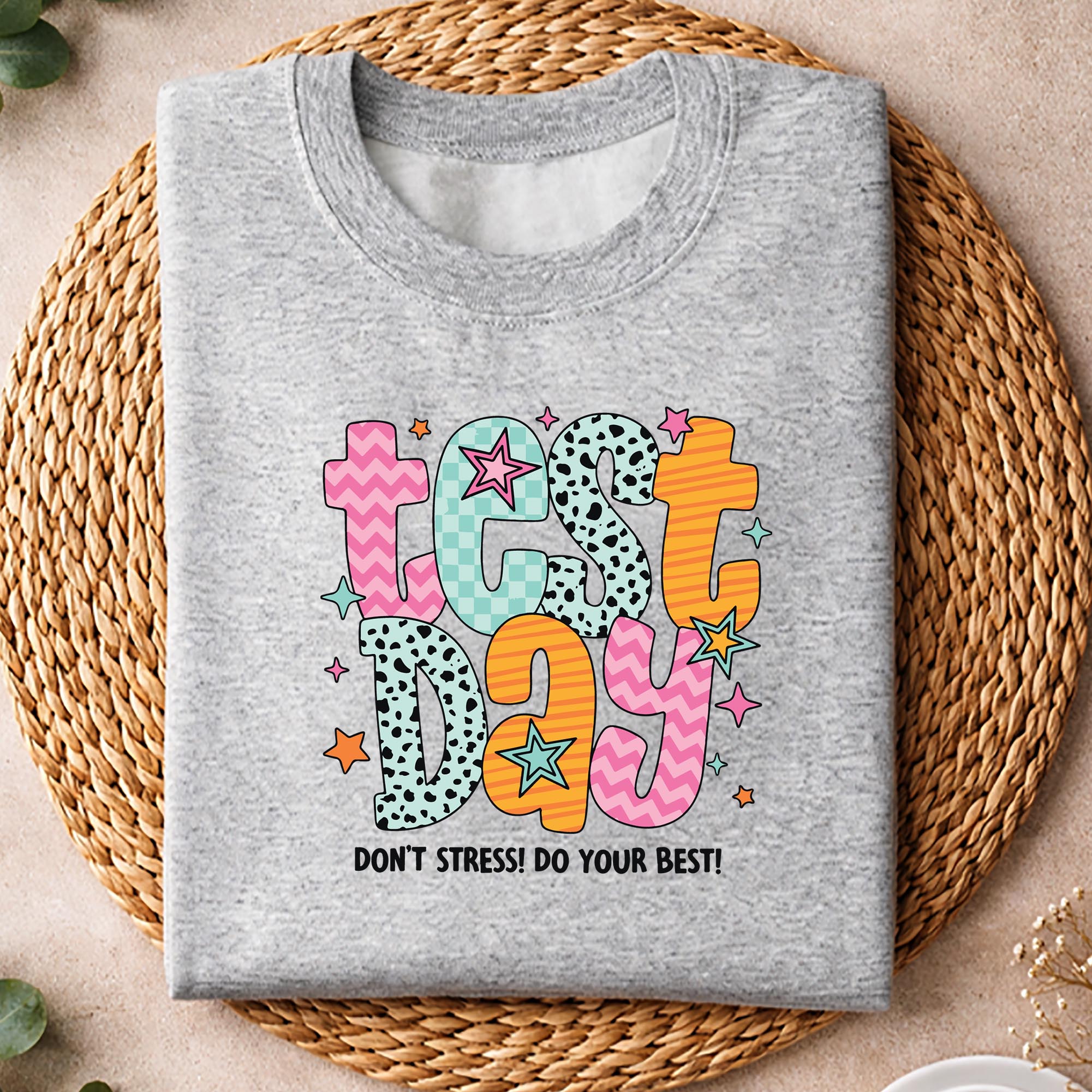 Walk into test day with confidence, calm, and a smile because this uplifting design is here to remind every student that they’ve got this. The “Test Day Don’t Stress Do Your Best” message brings positive energy into any classroom, helping ease anxiety while encouraging focus and self-belief when it matters most. Perfect for teachers who want to create a supportive and motivating environment, this design fits seamlessly on print on demand products like t shirts, posters, classroom decor, stickers, or even tote bags. It’s a thoughtful way to boost morale during testing season, making students feel seen, supported, and ready to succeed. Whether you’re preparing for standardized exams, daily quizzes, or big academic milestones, this inspirational teacher themed design adds a cheerful touch that keeps stress low and confidence high. It also makes a meaningful gift for educators, tutors, or parents who want to encourage a positive mindset in learners of all ages. With its friendly message and versatile appeal, this design is a must have for back to school season, test prep time, or anytime a little encouragement can make a big difference.